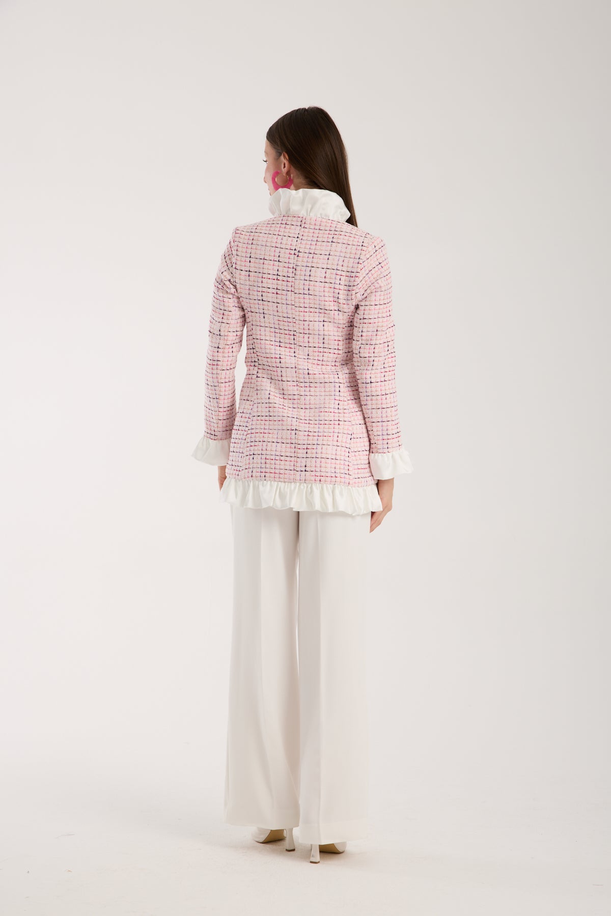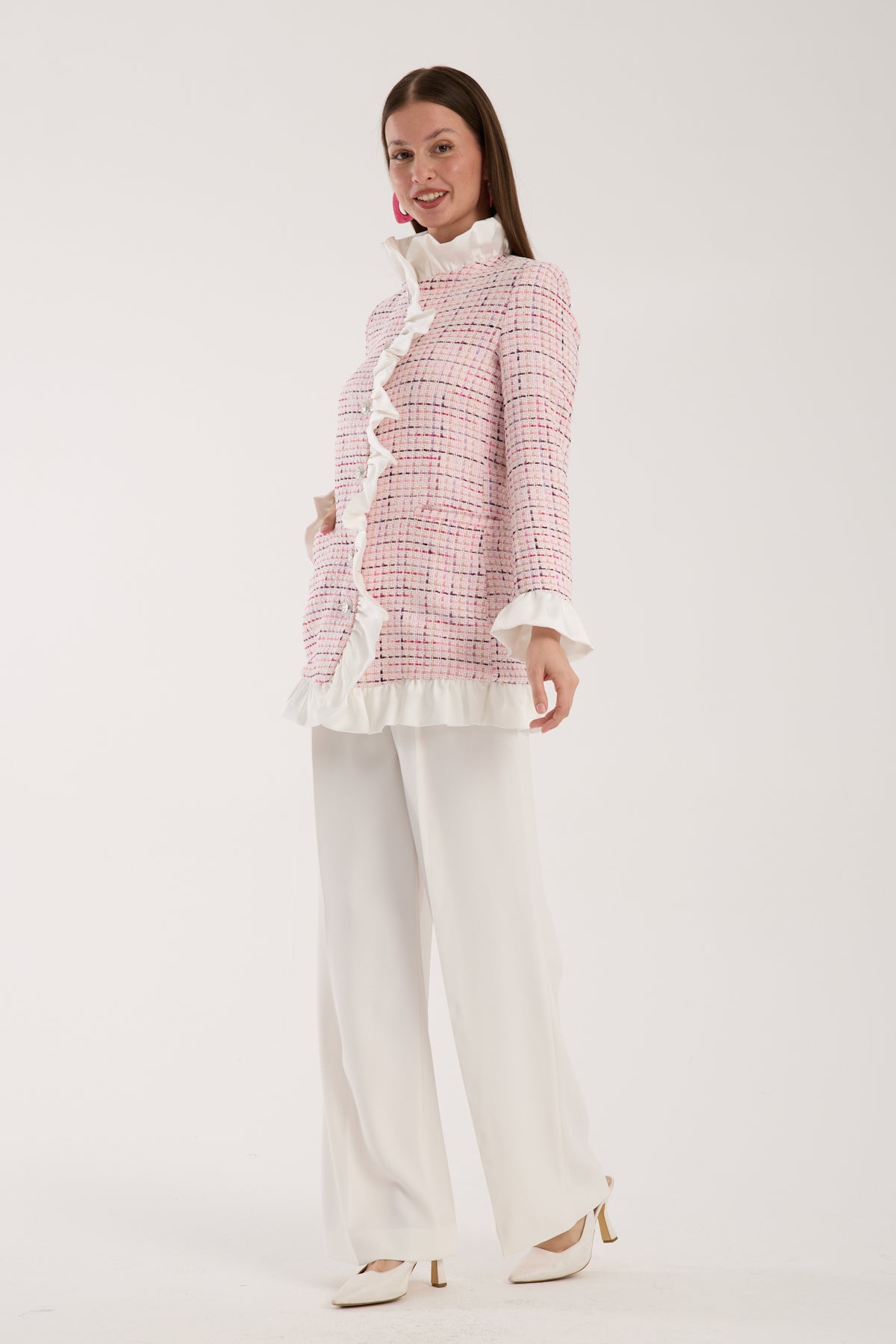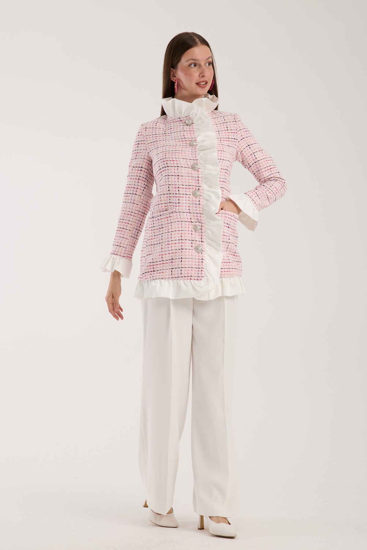 Feminen dokunuşlarla yeniden yorumlanan Elise Coat, pastel pembe tonlarındaki tweed kumaşıyla sofistike bir görünüm sunuyor. Ön kısmında yer alan fırfır detayları ve parlak düğmeleri tasarıma romantik bir hava katarken, fit kesimi modern bir siluet oluşturuyor. Hem günlük kombinlerinize hem de özel davet görünümlerinize zarif bir şıklık ekler. Boy uzunluğu 80 cm dir. Astarlıdır. Kuru temizleme önerilmektedir.