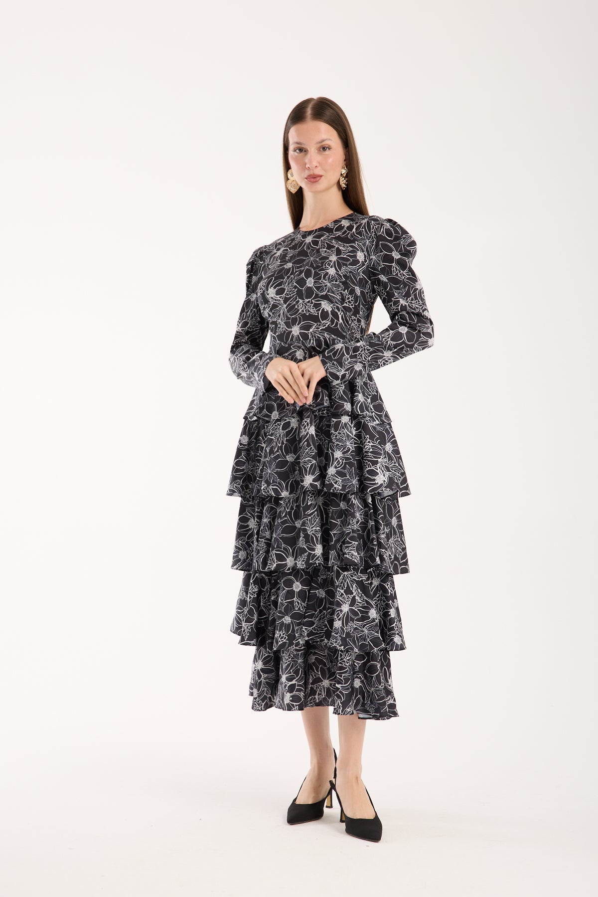 Minimal zarafet ile çarpıcı detayların buluştuğu tasarım. Siyah zemin üzerine kontrast beyaz floral desenleri, modern silueti ve feminen havasıyla stilinize sofistike bir dokunuş katar. Güçlü omuz hattı ve volanlı etek detayıyla hem gündüz hem gece görünümlerinde öne çıkan bir parça. Boy uzunluğu 135 cm dir.