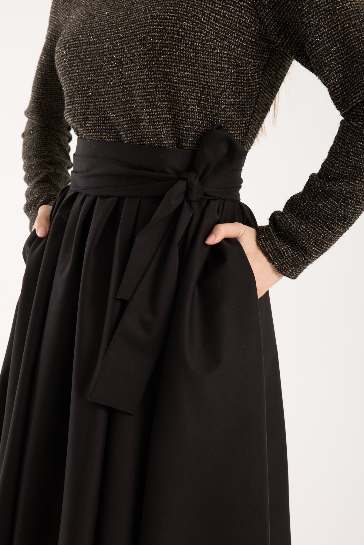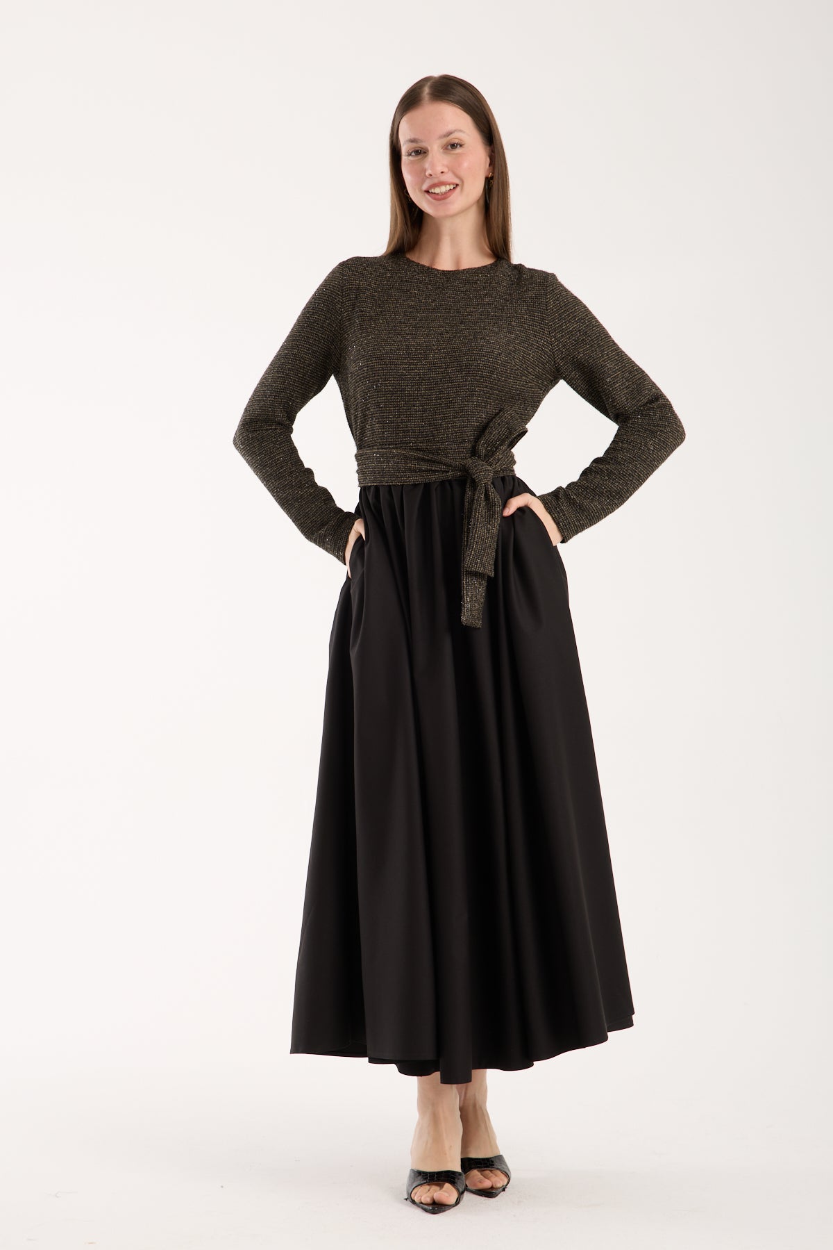 Zamansız şıklığıyla öne çıkan Velora Dress, ışıltılı üst kısmı ve volanlı siyah eteğiyle sofistike bir kontrast yaratıyor. Beldeki kuşak detayı feminen bir siluet oluştururken, akıcı eteği zarif bir hareket katıyor. Hem davetlerde hem de özel gecelerde stilinizi tamamlayacak güçlü bir parça. Boy uzunluğu 140 cm